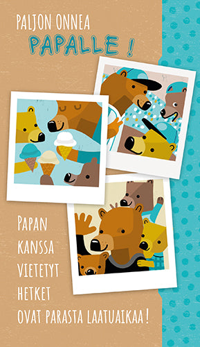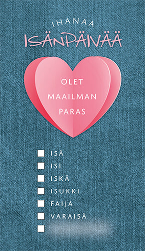 Isänpäivänä on aika muistaa isää, isoisää, isiä, iskää, faijaa – sitä rohkeaa, vahvaa ja rakastavaa ihmistä elämässämme, joka opastaa ja kannustaa. Löydä isällesi täydellinen kortti, joka välittää kiitoksesi juuri teidän näköisesti.