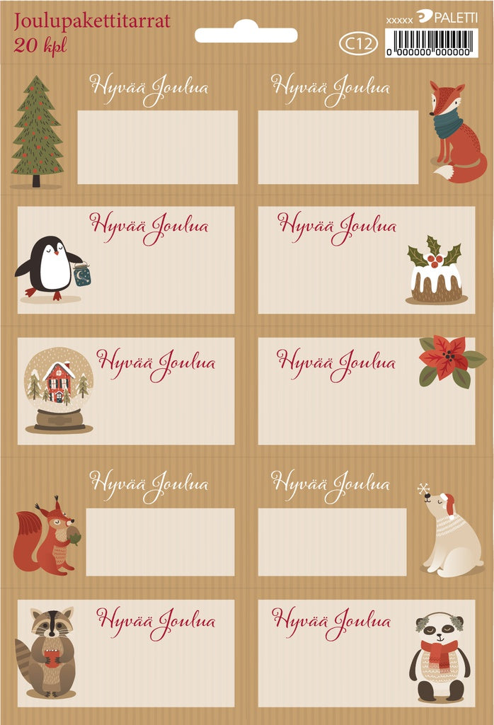 Arkissa 10 tarraa, tarroissa teksti: Hyvää Joulua