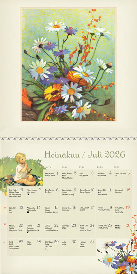 Årskalender 2026Kielet: suomi, ruotsiSisältää suomalaiset ja suomenruotsalaiset nimi- ja liputuspäivät