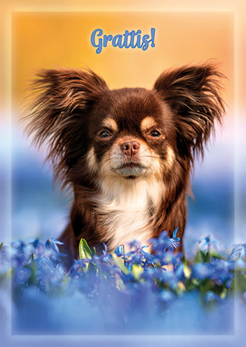 1-osainen ruotsinkielinen onnittelukortti, postikortti. Chihuahua, en liten hund i ett blomsterfält, födelsedag