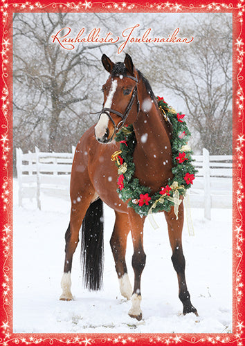 Hevonen ja joulukranssi.