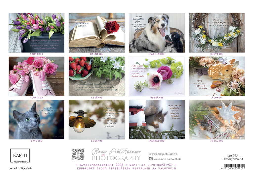 Ajatelmakalenteri 2026, kuukaudet Ilona Pietiläisen ajatelmin ja valokuvin.