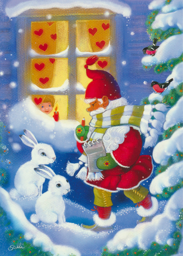 Puput, jänikset, tonttu, luminen piha, punatulkut, kodin lämpö